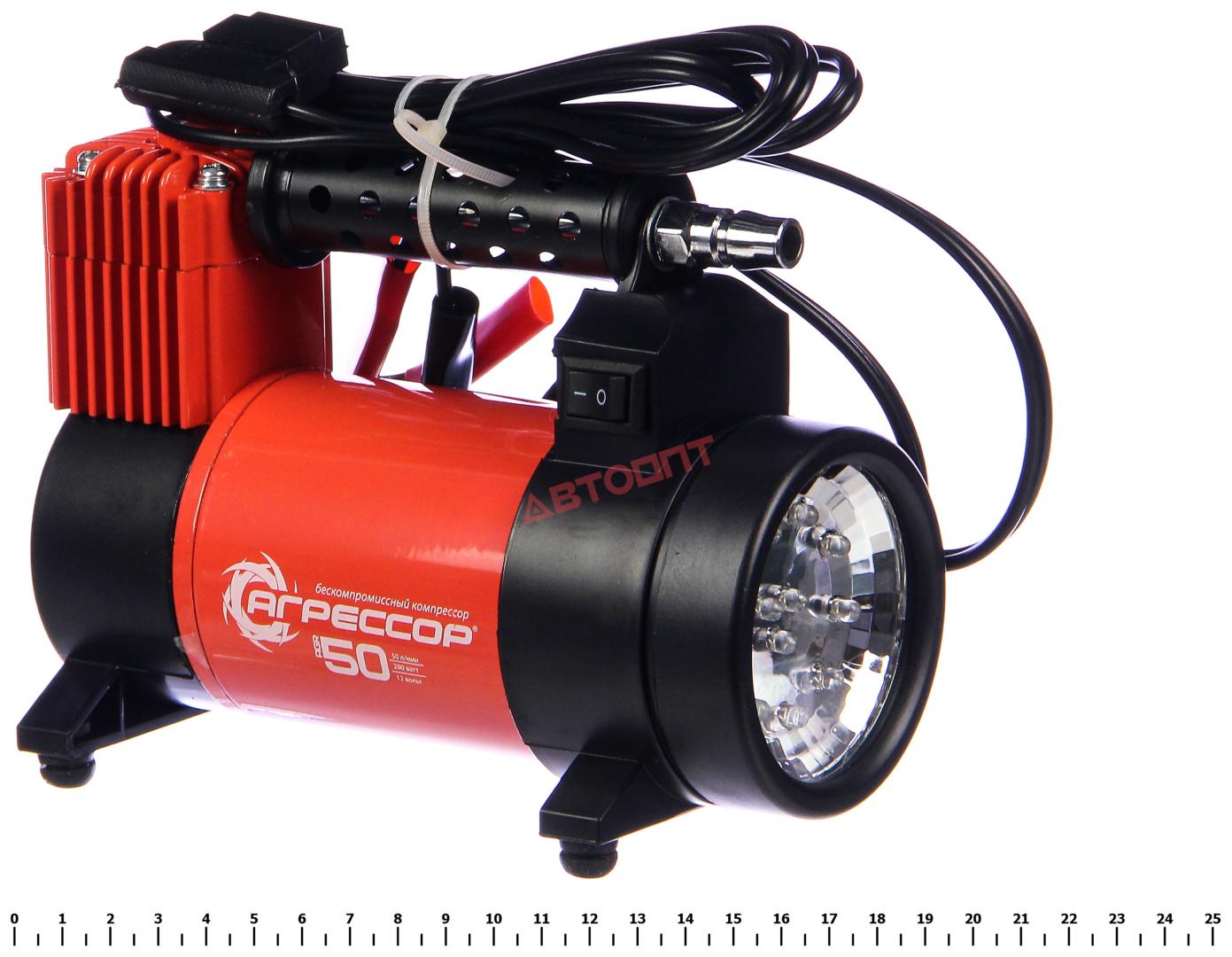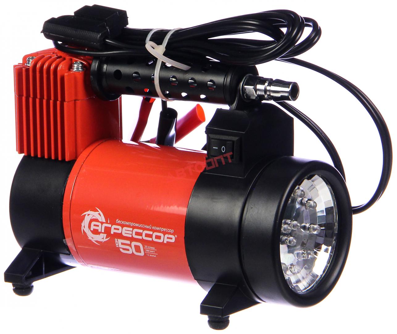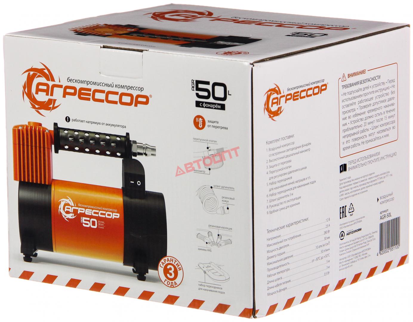 Компрессор "АГРЕССОР" AGR-50L 50 л/мин (10 Атм) с фонарем сумка (питание от акб) "AUTOPROFI"