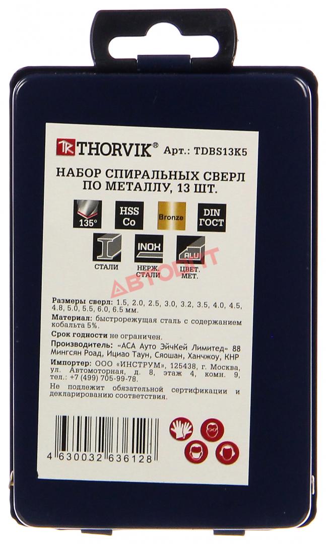 Набор сверл по металлу 13 предм. Co (кобольтовые) (1.5-6.5 мм) (TDBS13K5) в металл. кейсе "THORVIK"