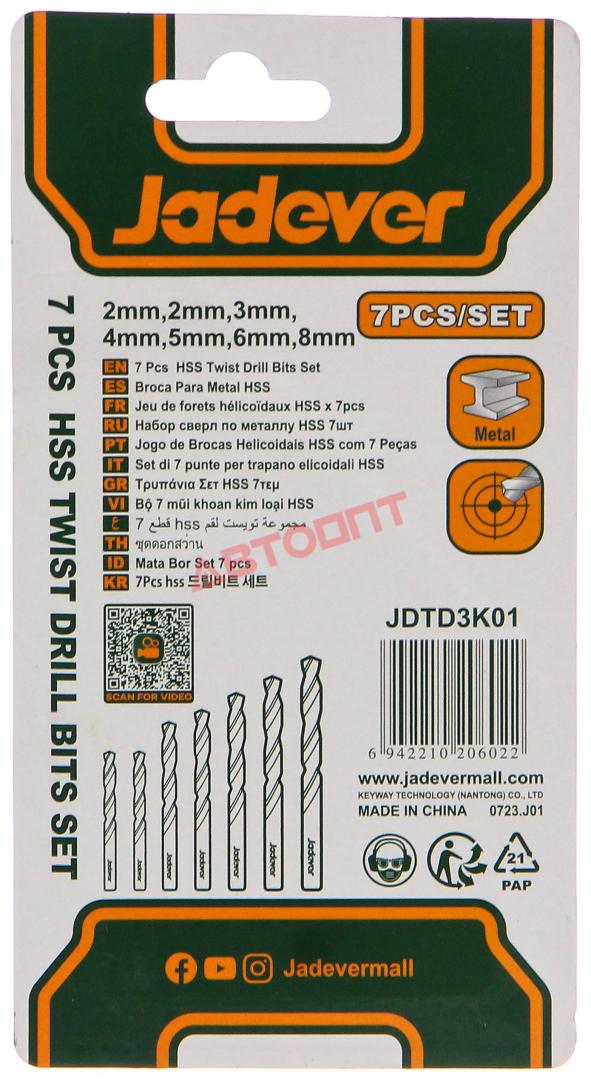Набор сверл по металлу 7 предм. (2-8 мм), пластиковый кейс (JDTD3K01) "JADEVER"