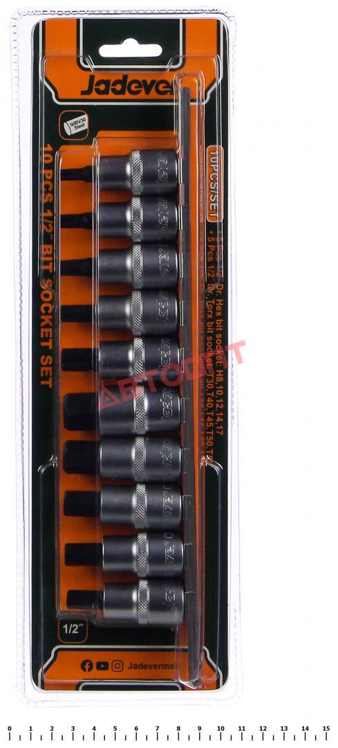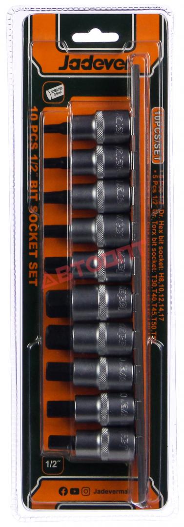Насадка под квадрат 1/2" с вставкой TORX, HEX (набор из 10шт), на держателе (JDST1412) "JADEVER"