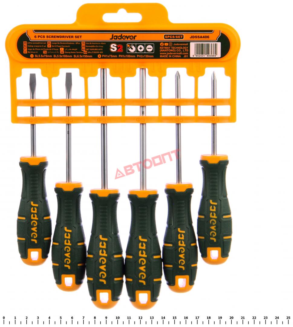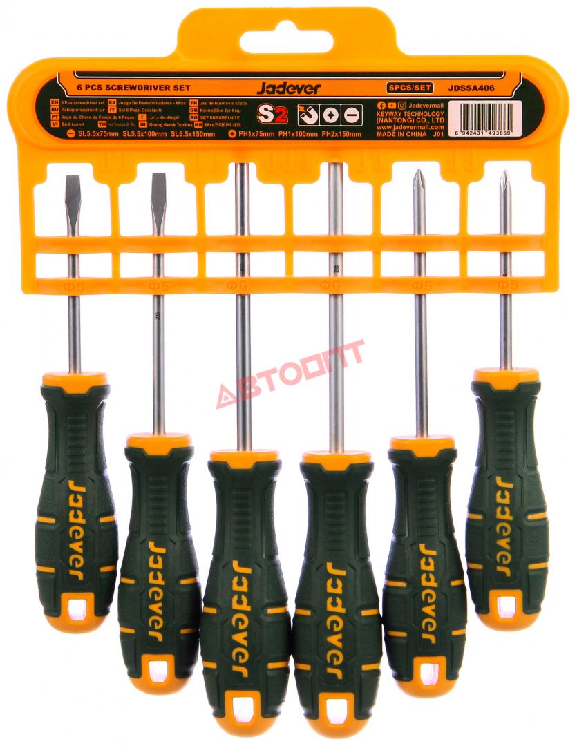 Отвертки (набор 6 предметов) SL5.5*75мм, SL5.5*100мм, SL6,5*150мм, PH1*75мм, PH1*100мм, PH2*150мм (JDSSA406) "JADEVER"