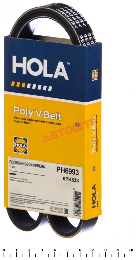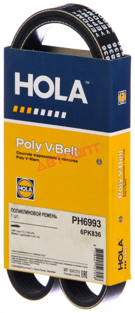 Ремень поликлиновой 6PK 836 LADA Largus 1,6 8V, RENAULT Logan,Sandero 1.6 8V без ГУР (PH6993) "HOLA" (Малайзия)